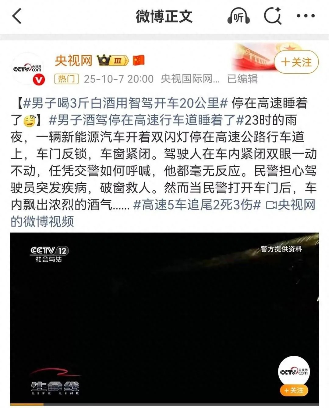 10月7日,据央视网报道,5月31日23时的雨夜,一辆新能源汽车开着双闪灯停在浙江杭州的一条高速公路行车道上,车门反锁,车窗紧闭。驾驶人在车内紧闭双眼一动不动,任凭交警如何呼喊,他都毫无反应。民警担心驾驶员突发疾病,破窗救人。然而当民警打开车门后,车内飘出浓烈的酒气。男子告诉交警,他连续喝了两场酒,一共约3斤白酒。此事引起网友热议,相关话题冲上热搜第一。