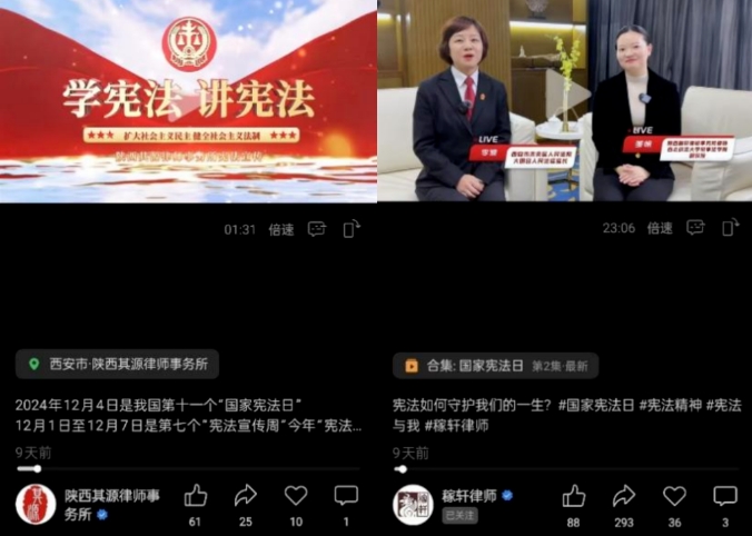 陕西稼轩律师事务所邀请西安市未央区人民法院大明宫人民法庭庭长李波、西北政法大学刑事法学院副教授邹帆讲解宪法如何守护我们的一生;陕西其源律师事务所利用视频号开设“其源讲堂”,面向社会公众普及宪法知识;陕西格道律师事务所在视频号发布“知法于心,守法于行”宪法宣传小视频,陕西秦靖律师事务所制作发布“弘扬宪法精神 维护宪法权威”系列普法视频,倡导社会公众尊崇宪法、学习宪法、遵守宪法、维护宪法、运用宪法。