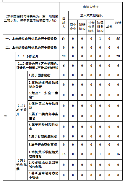 全年新收政府信息公开申请55件,其中:通过依申请公开平台申请52件,信函申请3件,均按规定时限答复完毕。全年共接听人民群众来电1100余通,耐心解答群众政策信息咨询,积极回应群众关切。