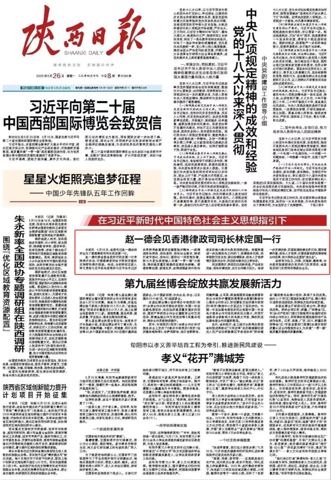 赵一德代表省委省政府对林定国一行来陕表示欢迎,对香港律政司给予陕西发展的支持帮助表示感谢。他说,当前陕西正深入学习贯彻习近平法治思想和习近平总书记历次来陕考察重要讲话重要指示精神,一体推进法治陕西、法治政府、法治社会建设,持续打造市场化、法治化、国际化一流营商环境,努力为更加深度融入共建“一带一路”大格局、推动高质量发展提供坚强法治保障。香港背靠祖国、联通世界,在推进国家涉外法治体系和能力建设中具有独特优势。希望陕港进一步加强法治工作部门、法律服务机构、法学院校交流互动,深化法律服务、法治人才培养等方面务实合作,共促法治建设迈上新台阶。